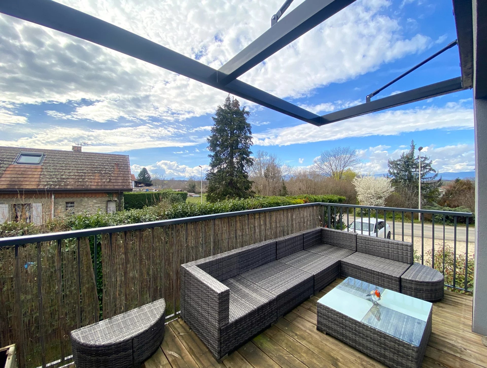 An equipped kitchen opening onto the living room with access to a west-facing terrace with unobstructed views of the fields.