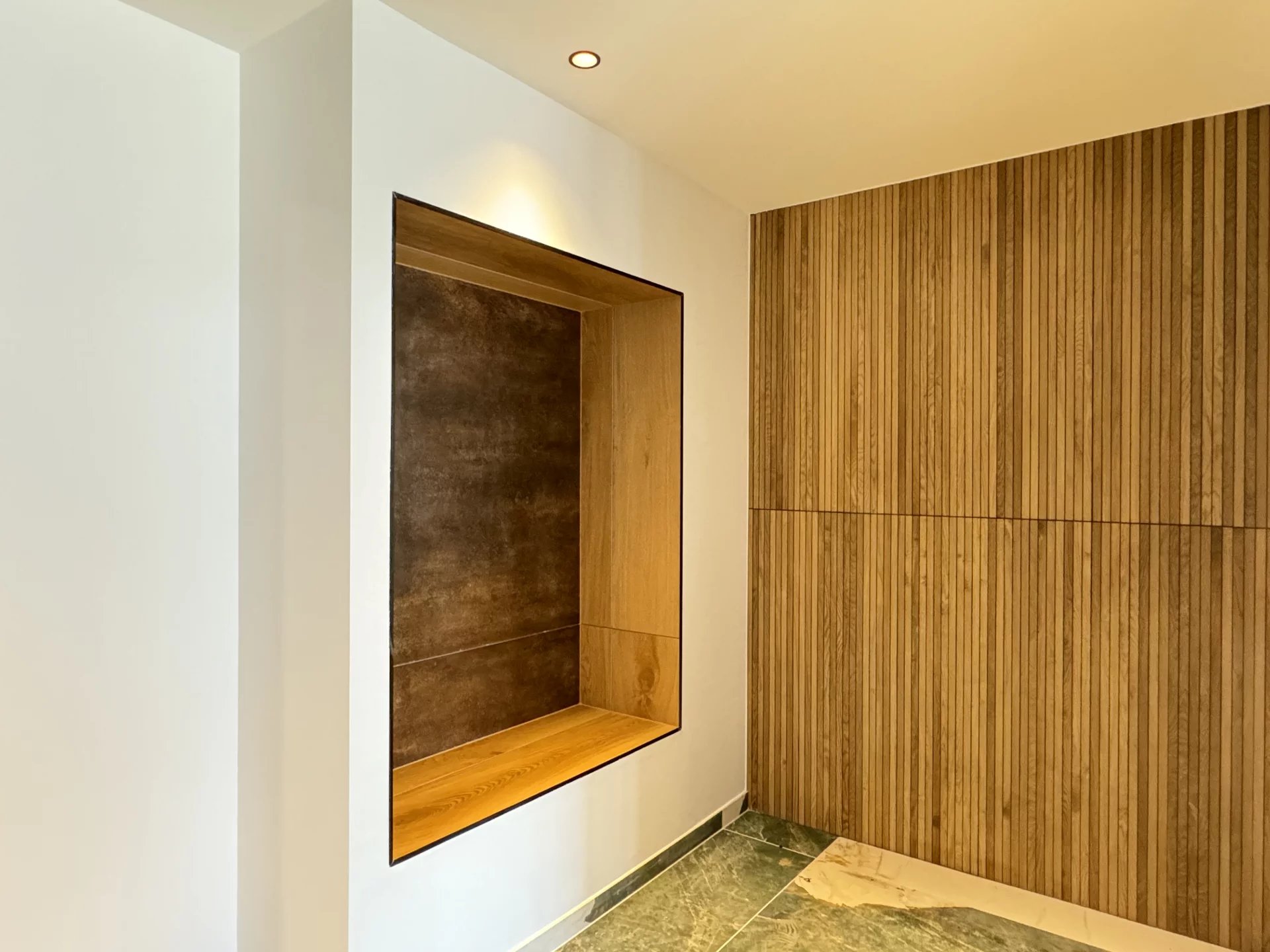 A bedroom with wall-mounted dressing room and direct access to the terrace, a shower room with vanity unit, toilet and washing machine.