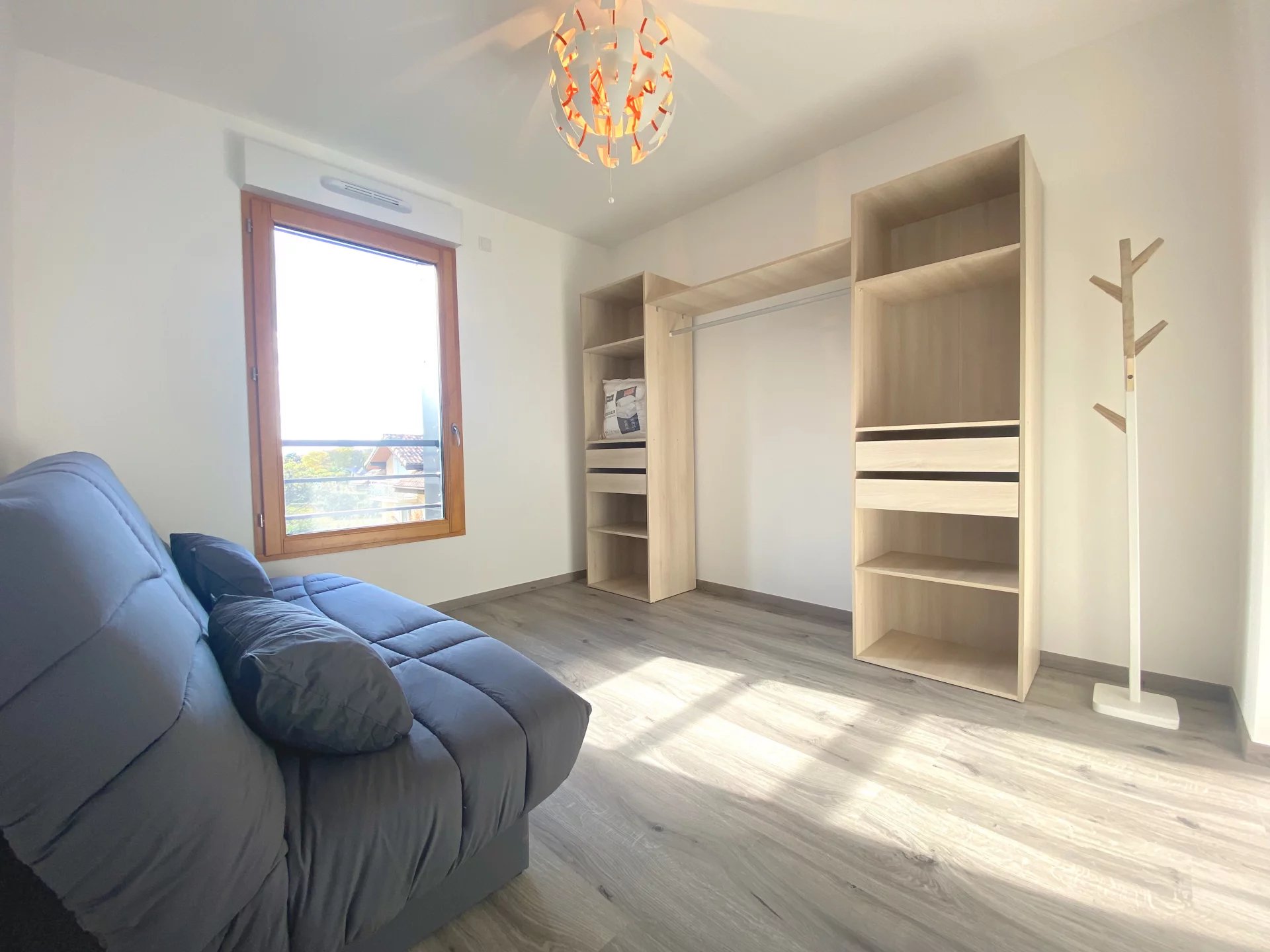Bel appartement de 61 m² meublé au coeur d'une résidence neuve de 2021 dans un cadre champêtre. Situé au 2ème et dernier étage avec ascenseur, le bien dispose d'une cuisine entièrement équipée (plaque induction, hotte, four, micro-ondes, réfrigérateur-congélateur, et lave-vaisselle) ouverte sur le salon séjour avec balcon exposé Sud-Ouest offrant une vue Lac. Deux chambres, une salle de douche avec arrivée d'eau pour le lave-linge, et des toilettes séparés. L'appartement dispose d'un garage en sous-sol avec porte motorisée, électricité et prise de courant.