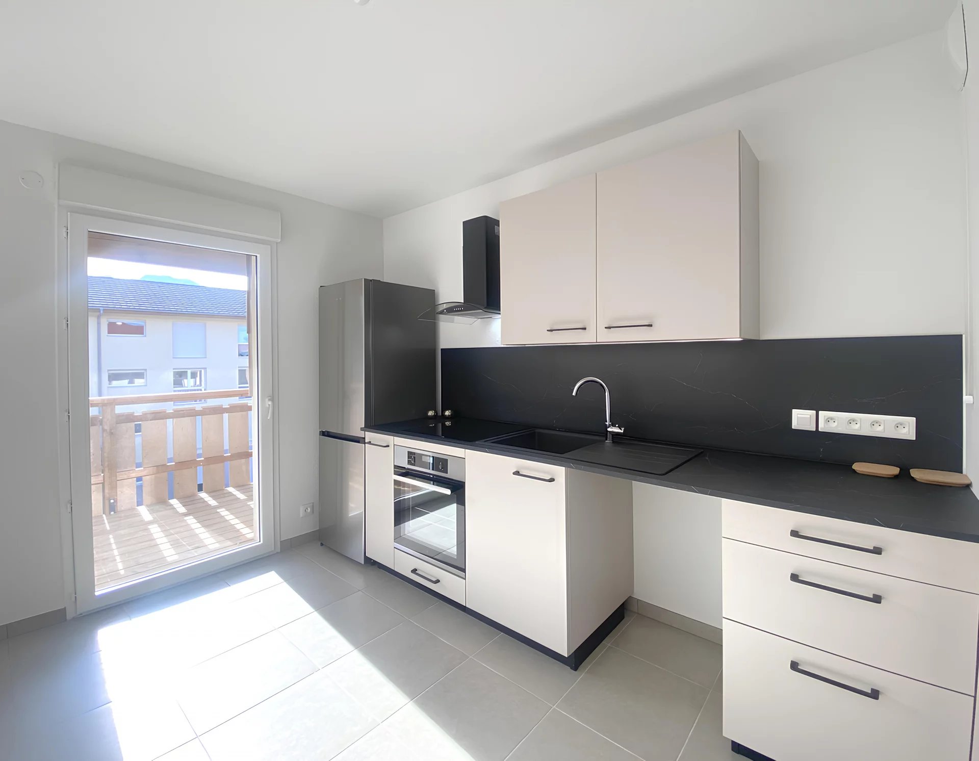 Une cuisine équipée ouverte sur le séjour donnant accès au balcon exposé Sud-Est.