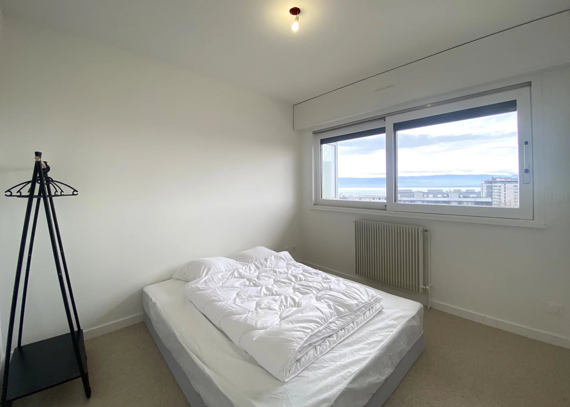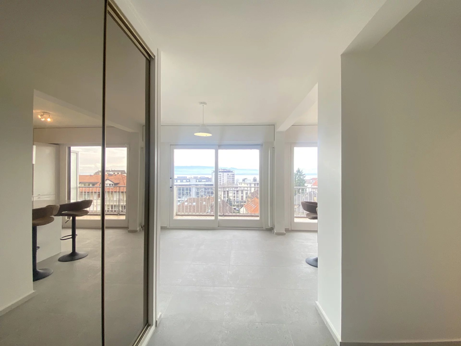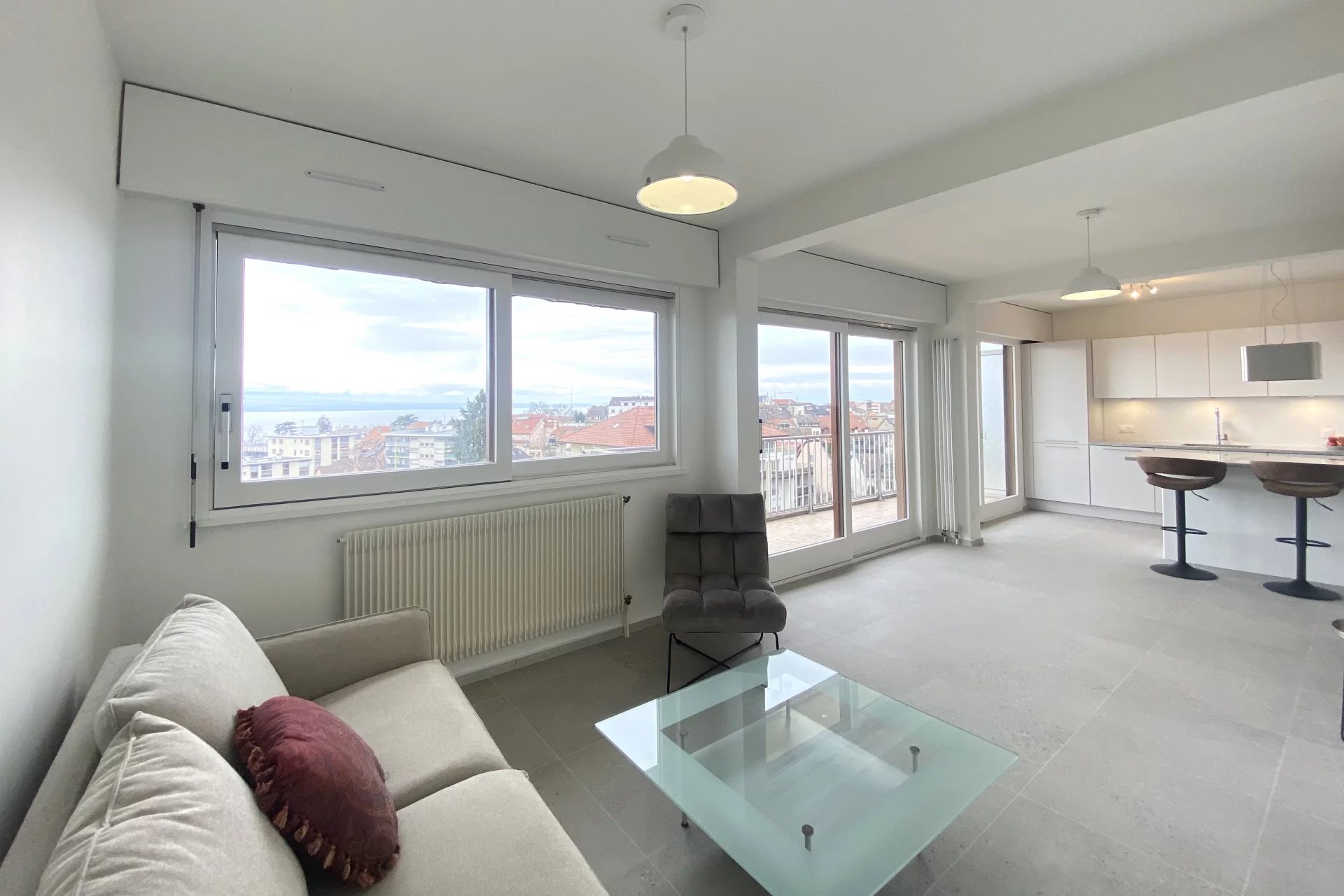 Cet appartement T2 entièrement rénové et meublé offre un cadre de vie agréable en plein centre-ville de Thonon avec un balcon doté d'une vue dégagée sur le lac. Il bénéficie d'une cuisine équipée haut de gamme ouverte sur l'espace de vie, une salle d'eau avec douche à l'italienne, des toilettes séparées et une chambre avec vue lac.