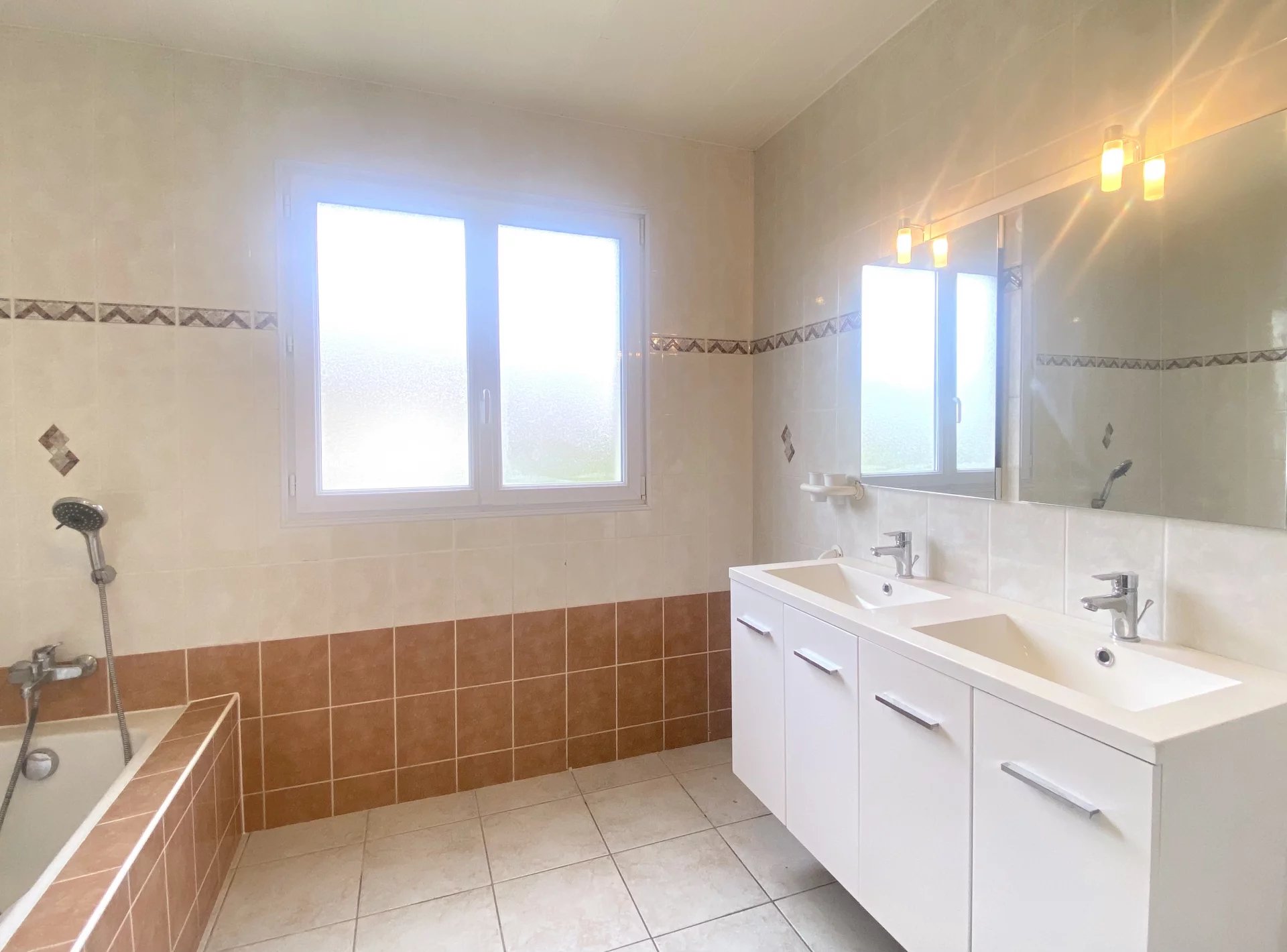 Au rez-de-chaussée, une entrée avec placard, une cuisine équipée (plaque de cuisson gaz, hotte, four, four micro-ondes, lave-vaisselle, réfrigérateur-congélateur) ouverte sur salon-séjour avec accès sur terrasse/jardin exposé à l'ouest. Deux chambres, une salle de bain avec double-vasque, une baignoire et une douche à l'italienne, des toilettes séparées.