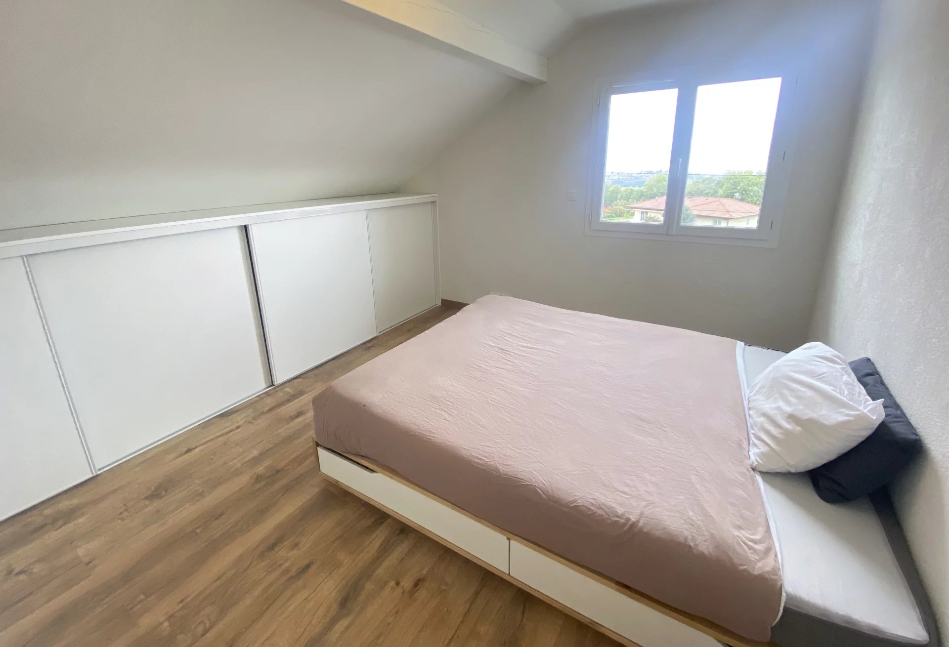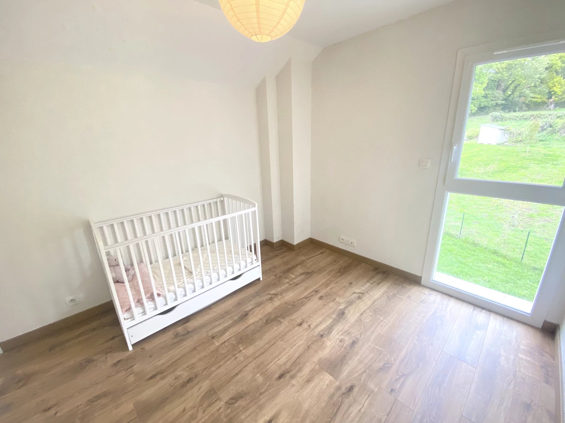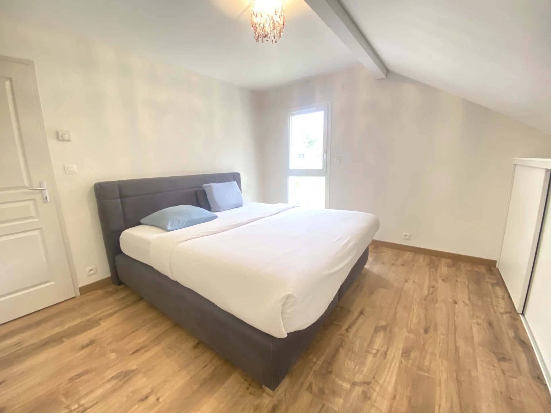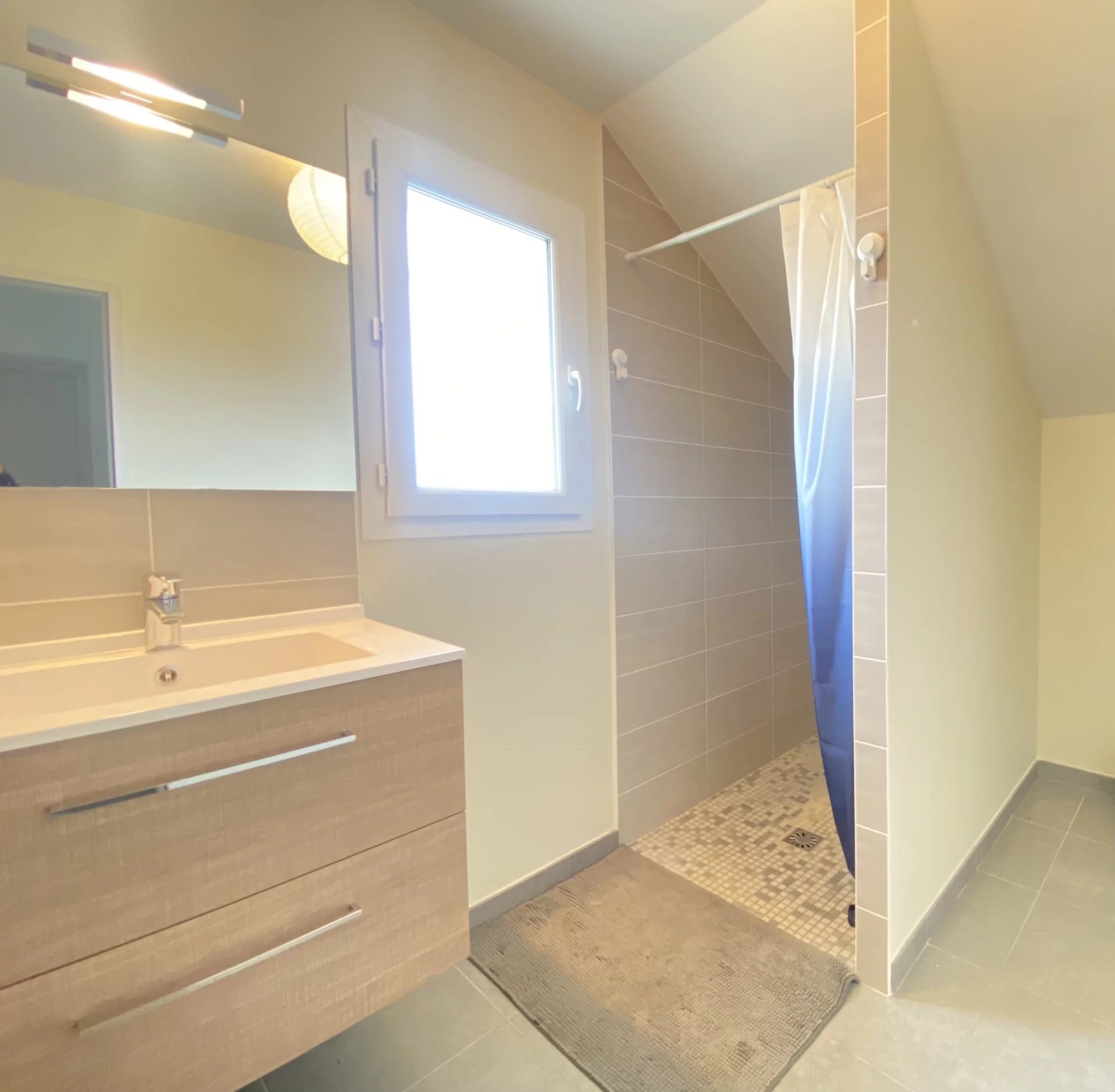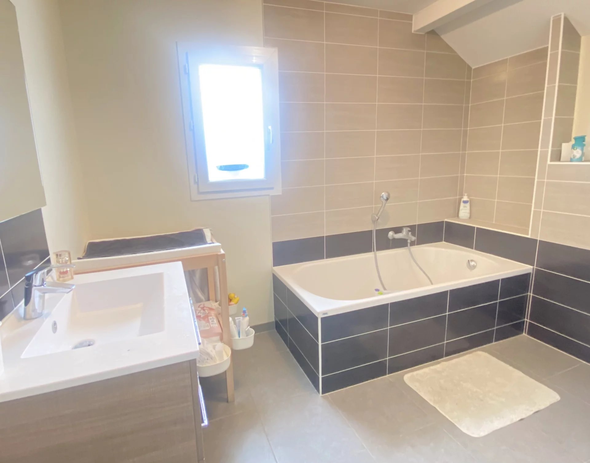 Second demi-niveau, trois grandes chambres avec placard intégré, une salle de bain spacieuse avec meuble-vasque et toilettes.